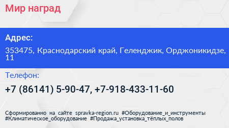 Мир наград по адресу 353475, Краснодарский край, Геленджик, Орджоникидзе, 11 в дальнейшем Организация, размещена в следующих категориях: