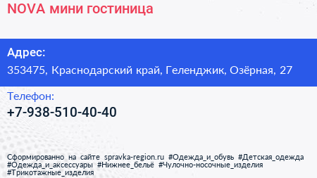 NOVA, мини-гостиница по адресу 353475, Краснодарский край, Геленджик, Озёрная, 27 в дальнейшем Организация, размещена в следующих категориях: