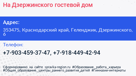 На Дзержинского, гостевой дом по адресу 353475, Краснодарский край, Геленджик, Дзержинского, 6 в дальнейшем Организация, размещена в следующих категориях: