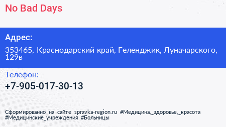 No Bad Days по адресу 353465, Краснодарский край, Геленджик, Луначарского, 129в в дальнейшем Организация, размещена в следующих категориях: