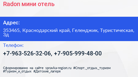 Radon, мини-отель по адресу 353465, Краснодарский край, Геленджик, Туристическая, 3д в дальнейшем Организация, размещена в следующих категориях: