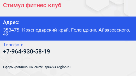 Стимул, фитнес-клуб по адресу 353475, Краснодарский край, Геленджик, Айвазовского, 49 в дальнейшем Организация, размещена в следующих категориях: