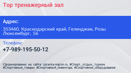 Тор, тренажерный зал по адресу 353460, Краснодарский край, Геленджик, Розы Люксембург, 56 в дальнейшем Организация, размещена в следующих категориях: