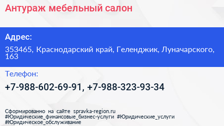 Антураж, мебельный салон по адресу 353465, Краснодарский край, Геленджик, Луначарского, 163 в дальнейшем Организация, размещена в следующих категориях: