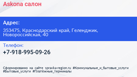 Askona, салон по адресу 353475, Краснодарский край, Геленджик, Новороссийская, 40 в дальнейшем Организация, размещена в следующих категориях: