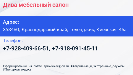 Дива, мебельный салон по адресу 353460, Краснодарский край, Геленджик, Киевская, 46а в дальнейшем Организация, размещена в следующих категориях: