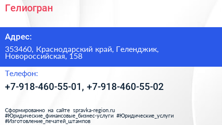 Гелиогран по адресу 353460, Краснодарский край, Геленджик, Новороссийская, 158 в дальнейшем Организация, размещена в следующих категориях: