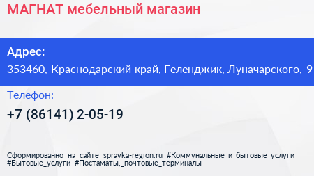 МАГНАТ, мебельный магазин по адресу 353460, Краснодарский край, Геленджик, Луначарского, 9 в дальнейшем Организация, размещена в следующих категориях: