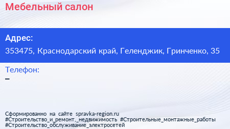 Мебельный салон по адресу 353475, Краснодарский край, Геленджик, Гринченко, 35 в дальнейшем Организация, размещена в следующих категориях: