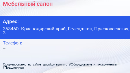 Мебельный салон по адресу 353460, Краснодарский край, Геленджик, Прасковеевская, 3 в дальнейшем Организация, размещена в следующих категориях: