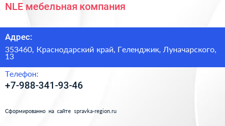 NLE, мебельная компания по адресу 353460, Краснодарский край, Геленджик, Луначарского, 13 в дальнейшем Организация, размещена в следующих категориях: