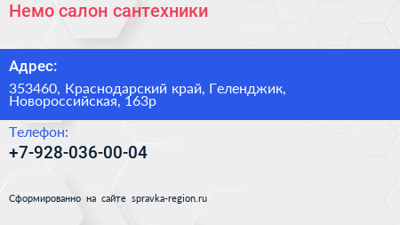 Немо, салон сантехники по адресу 353460, Краснодарский край, Геленджик, Новороссийская, 163р в дальнейшем Организация, размещена в следующих категориях: