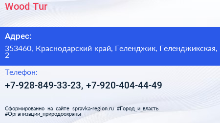 Wood Tur по адресу 353460, Краснодарский край, Геленджик, Геленджикская, 2 в дальнейшем Организация, размещена в следующих категориях: