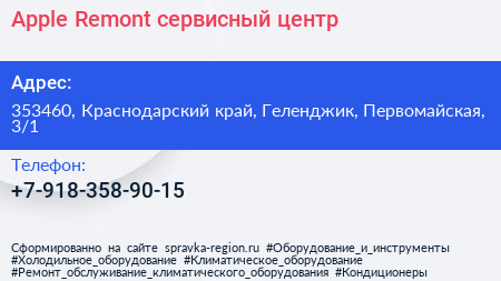 Apple Remont, сервисный центр по адресу 353460, Краснодарский край, Геленджик, Первомайская, 3/1 в дальнейшем Организация, размещена в следующих категориях: