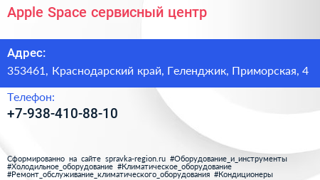 Apple Space, сервисный центр по адресу 353461, Краснодарский край, Геленджик, Приморская, 4 в дальнейшем Организация, размещена в следующих категориях: