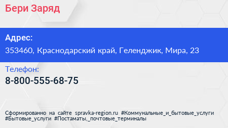 Бери Заряд по адресу 353460, Краснодарский край, Геленджик, Мира, 23 в дальнейшем Организация, размещена в следующих категориях: