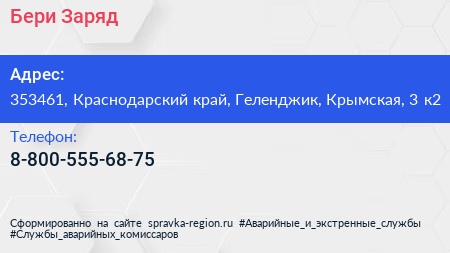 Бери Заряд по адресу 353461, Краснодарский край, Геленджик, Крымская, 3 к2 в дальнейшем Организация, размещена в следующих категориях: