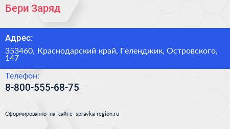 Бери Заряд по адресу 353460, Краснодарский край, Геленджик, Островского, 147 в дальнейшем Организация, размещена в следующих категориях: