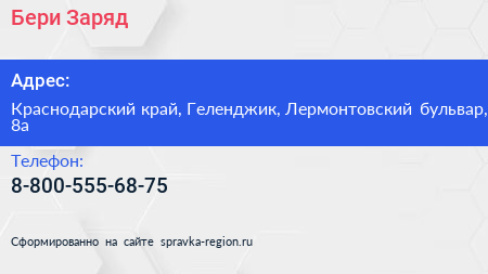 Бери Заряд по адресу Краснодарский край, Геленджик, Лермонтовский бульвар, 8а в дальнейшем Организация, размещена в следующих категориях: