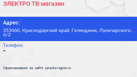 ЭЛЕКТРО+ТВ, магазин по адресу 353460, Краснодарский край, Геленджик, Луначарского, 6/2 в дальнейшем Организация, размещена в следующих категориях: