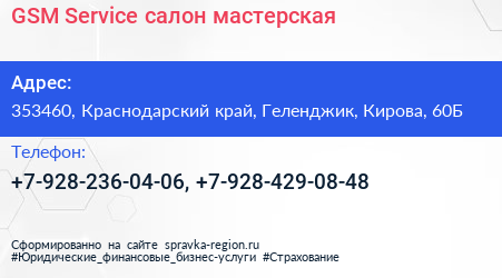GSM Service, салон-мастерская по адресу 353460, Краснодарский край, Геленджик, Кирова, 60Б в дальнейшем Организация, размещена в следующих категориях: