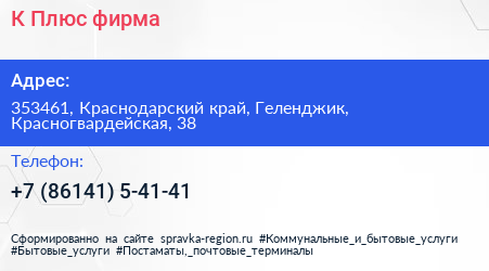 К.Плюс, фирма по адресу 353461, Краснодарский край, Геленджик, Красногвардейская, 38 в дальнейшем Организация, размещена в следующих категориях: