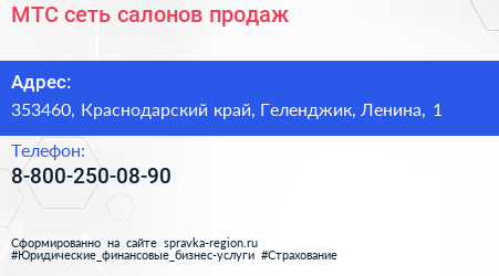 МТС, сеть салонов продаж по адресу 353460, Краснодарский край, Геленджик, Ленина, 1 в дальнейшем Организация, размещена в следующих категориях: