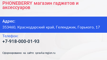PHONEBERRY, магазин гаджетов и аксессуаров по адресу 353460, Краснодарский край, Геленджик, Горького, 17 в дальнейшем Организация, размещена в следующих категориях: