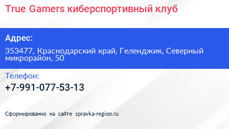 True Gamers, киберспортивный клуб по адресу 353477, Краснодарский край, Геленджик, Северный микрорайон, 50 в дальнейшем Организация, размещена в следующих категориях: