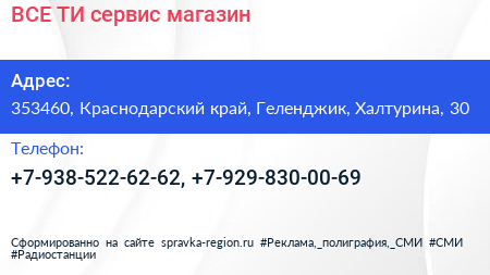 ВСЕ*ТИ, сервис-магазин по адресу 353460, Краснодарский край, Геленджик, Халтурина, 30 в дальнейшем Организация, размещена в следующих категориях: