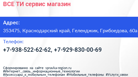 ВСЕ*ТИ, сервис-магазин по адресу 353475, Краснодарский край, Геленджик, Грибоедова, 60а в дальнейшем Организация, размещена в следующих категориях: