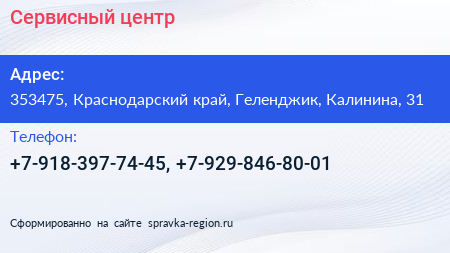 Сервисный центр по адресу 353475, Краснодарский край, Геленджик, Калинина, 31 в дальнейшем Организация, размещена в следующих категориях: