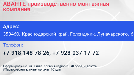 АВАНТЕ, производственно-монтажная компания по адресу 353460, Краснодарский край, Геленджик, Луначарского, 6 в дальнейшем Организация, размещена в следующих категориях: