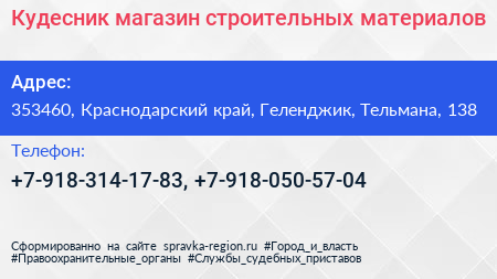 Кудесник, магазин строительных материалов по адресу 353460, Краснодарский край, Геленджик, Тельмана, 138 в дальнейшем Организация, размещена в следующих категориях: