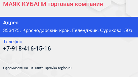 МАЯК КУБАНИ, торговая компания по адресу 353475, Краснодарский край, Геленджик, Сурикова, 50а в дальнейшем Организация, размещена в следующих категориях: