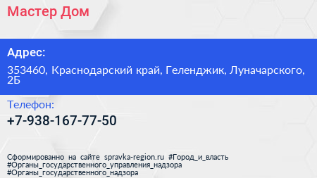 Мастер Дом по адресу 353460, Краснодарский край, Геленджик, Луначарского, 2Б в дальнейшем Организация, размещена в следующих категориях: