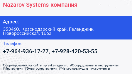Nazarov Systems, компания по адресу 353460, Краснодарский край, Геленджик, Новороссийская, 166а в дальнейшем Организация, размещена в следующих категориях:
