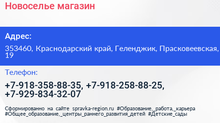 Новоселье, магазин по адресу 353460, Краснодарский край, Геленджик, Прасковеевская, 19 в дальнейшем Организация, размещена в следующих категориях: