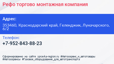 Рефо, торгово-монтажная компания по адресу 353460, Краснодарский край, Геленджик, Луначарского, 6/2 в дальнейшем Организация, размещена в следующих категориях: