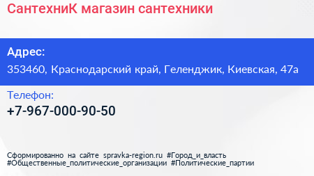 СантехниК, магазин сантехники по адресу 353460, Краснодарский край, Геленджик, Киевская, 47а в дальнейшем Организация, размещена в следующих категориях:
