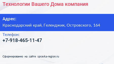 Технологии Вашего Дома, компания по адресу Краснодарский край, Геленджик, Островского, 164 в дальнейшем Организация, размещена в следующих категориях: