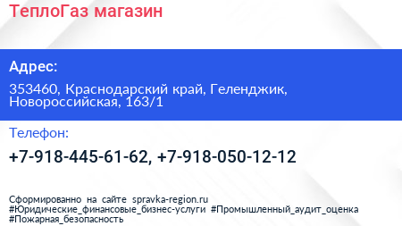 ТеплоГаз, магазин по адресу 353460, Краснодарский край, Геленджик, Новороссийская, 163/1 в дальнейшем Организация, размещена в следующих категориях: