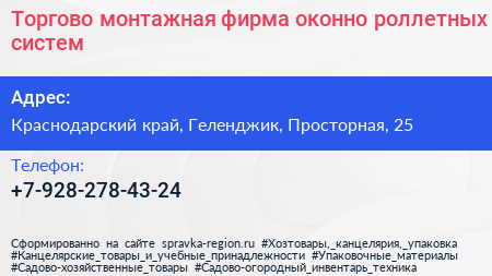 Торгово-монтажная фирма оконно-роллетных систем по адресу Краснодарский край, Геленджик, Просторная, 25 в дальнейшем Организация, размещена в следующих категориях:
