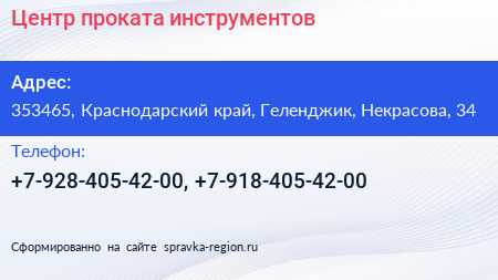 Центр проката инструментов по адресу 353465, Краснодарский край, Геленджик, Некрасова, 34 в дальнейшем Организация, размещена в следующих категориях: