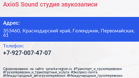 AxioS Sound, студия звукозаписи по адресу 353460, Краснодарский край, Геленджик, Первомайская, 61 в дальнейшем Организация, размещена в следующих категориях: