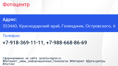 Фотоцентр по адресу 353460, Краснодарский край, Геленджик, Островского, 6 в дальнейшем Организация, размещена в следующих категориях: