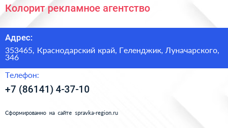 Колорит, рекламное агентство по адресу 353465, Краснодарский край, Геленджик, Луначарского, 346 в дальнейшем Организация, размещена в следующих категориях:
