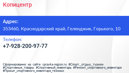 Копицентр по адресу 353460, Краснодарский край, Геленджик, Горького, 10 в дальнейшем Организация, размещена в следующих категориях: