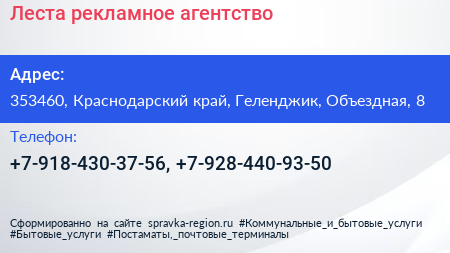 Леста, рекламное агентство по адресу 353460, Краснодарский край, Геленджик, Объездная, 8 в дальнейшем Организация, размещена в следующих категориях: