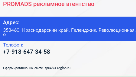 PROMADS, рекламное агентство по адресу 353460, Краснодарский край, Геленджик, Революционная, 6 в дальнейшем Организация, размещена в следующих категориях: